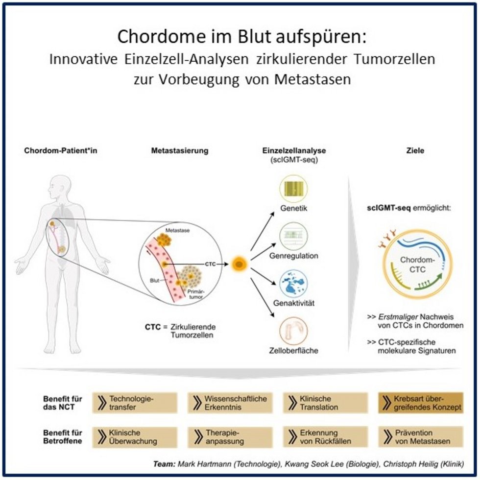 Chordome sind seltene, langsam wachsende, aber aggressive Tumoren der Wirbelsäule und Schädelbasis; Rückfälle sind bei Chordomen häufig und sie können metastasieren. Für die Entstehung von Metastasen sind zirkulierende Tumorzellen (CTCs) im Blut von zentraler Bedeutung. Bei Chordomen wurden CTCs bisher jedoch noch nicht untersucht.