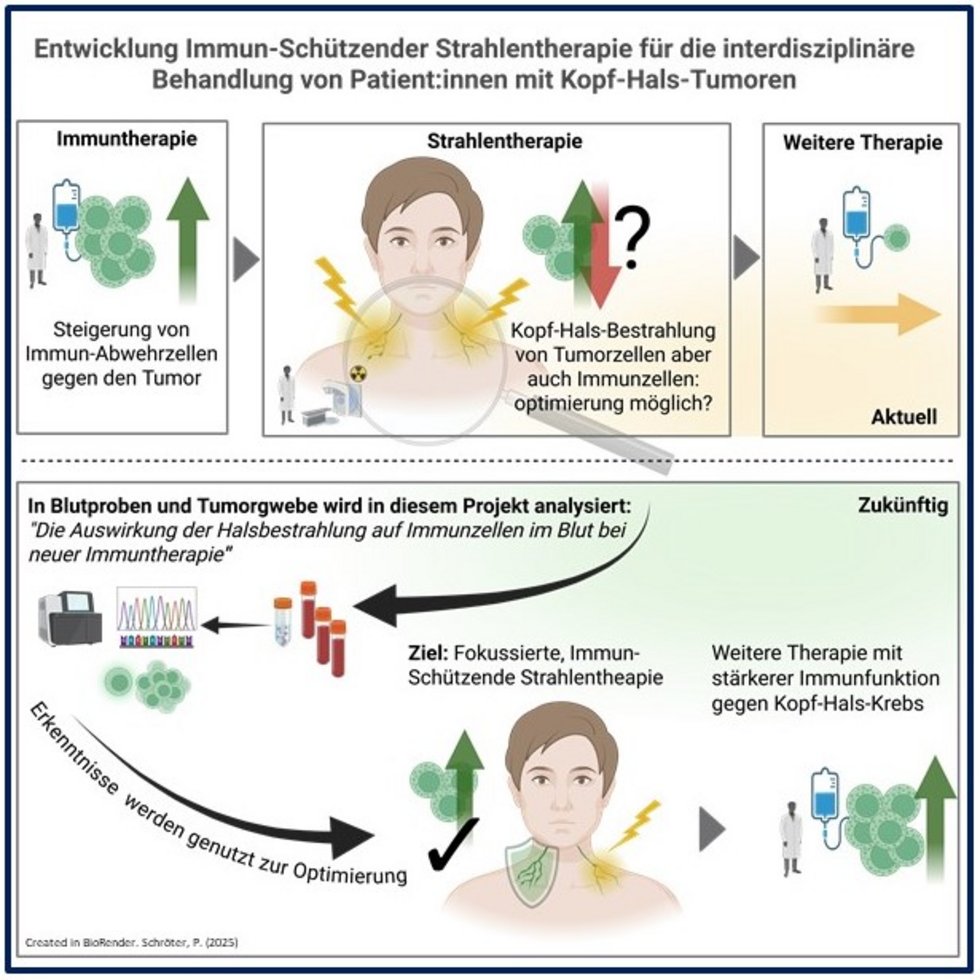 Bislang war die großflächige prophylaktische Halsbestrahlung nach der Operation Standard, um kleinste Tumorreste zu beseitigen. Sie trifft jedoch auch viele Immunzellen und Lymphbahnen, und die Auswirkungen auf die Immunabwehr sind noch unzureichend untersucht. Ein präzises Verständnis der Bestrahlungswirkungen auf das Immunsystem ist daher notwendig, um die Therapie optimal abzustimmen.