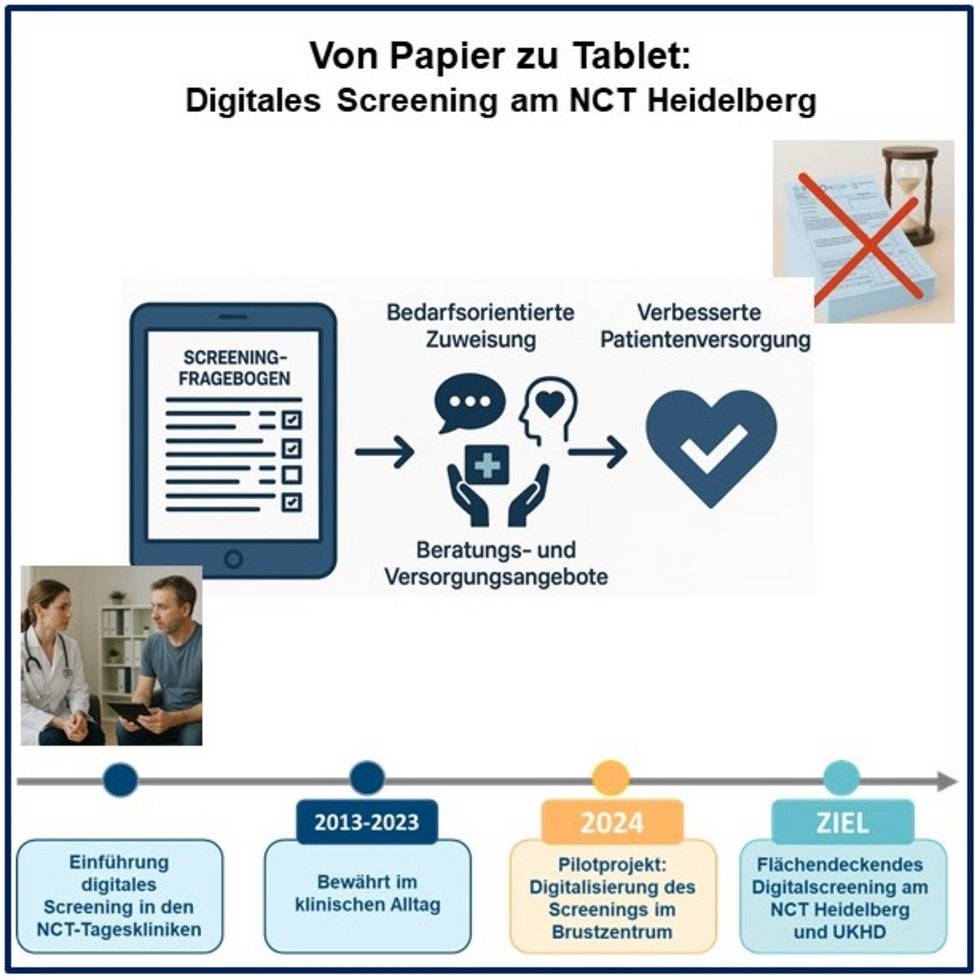 Am NCT Heidelberg wurde 2013 ein digitales Screening eingeführt, das bundesweit Vorbildcharakter hat. Bisher war die Nutzung auf das NCT-Gebäude beschränkt. 2024 startete im Brustzentrum ein erfolgreiches Pilotprojekt mit tabletbasiertem Screening. Eine Ausweitung auf weitere Organzentren ist daher gut machbar.