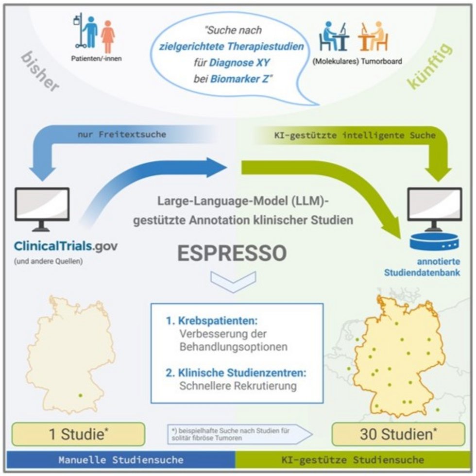 ESPRESSO adressiert dieses Problem mit einer automatisierten, KI-gestützten Annotationsmethode. Diese analysiert Studienprotokolle aus Studiendatenbanken, strukturiert und harmonisiert Informationen zu Behandlungsarmen, Krebsarten, Biomarkern sowie Therapien und ergänzt fehlende Daten aus weiteren öffentlich verfügbaren Quellen. In einem Pilotversuch konnten so 30 passende Studien für einen Patienten mit einer seltenen Tumorerkrankung identifiziert werden – konventionell wurde nur eine Studie gefunden.