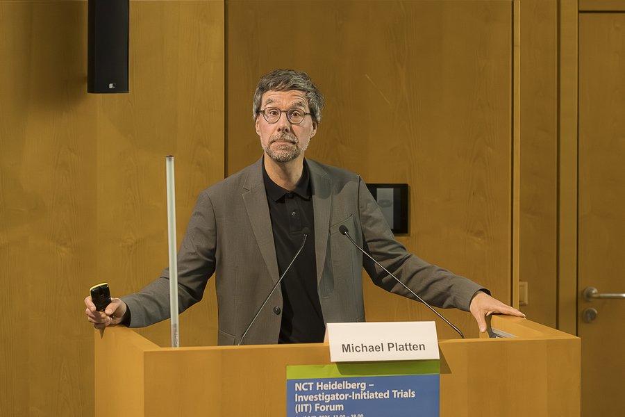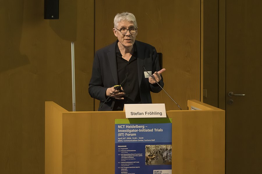 Stefan Fröhling, Geschäftsführender Direktor am NCT Heidelberg und Leiter der Abteilung Translationale Medizinische Onkologie am DKFZ, eröffnete die Veranstaltung und stellte die Entwicklung des NCT mit sechs Standorten seit 2023 und die zentralen Ziele des Overarching Clinical Translational Trial (OCT²)-Programms vor. In den folgenden Fachvorträgen führten Richard Schlenk, Guy Ungerechts und Keno März als Leitung des Clinical Trial Centers des NCT Heidelberg tiefer in das Programm ein und schilderten Förderbedingungen, Prozesse, aktuelle Entwicklungen, Unterstützungsstrukturen sowie Aktivitäten im Bereich Digital Oncology. Michael Platten, Leiter der Klinischen Kooperationseinheit Neuroimmunologie und Hirntumorimmunologie sowie Direktor der Neurologischen Klinik Universitätsmedizin Mannheim, präsentierte konkrete Erfahrungen aus der Projektierung und Begutachtung der Studie STAR-VACC. Stefan Fröhling und Richard Schlenk stellten den Weg zur Studie RATIONALE vor und diskutierten Herausforderungen und Erfolgsfaktoren in der Umsetzung von IITs im OCT²-Programm des NCT.