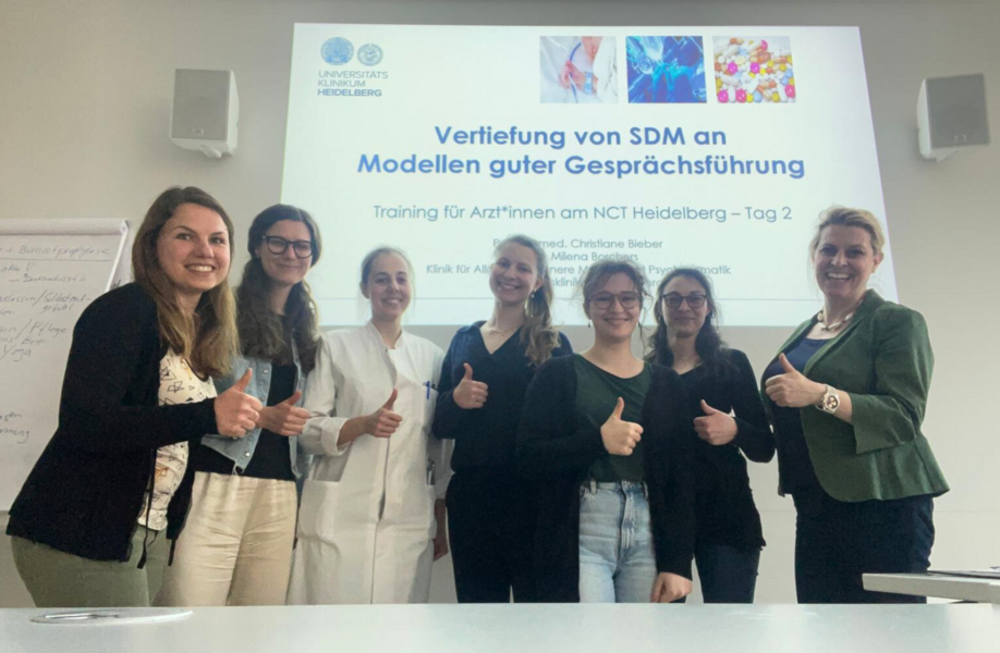 Am NCT Heidelberg als Comprehensive Cancer Center fand am 27. und 28. März die erste Fortbildung zum SDM statt, die von Christiane Bieber, Oberärztin an der Klinik für Allgemeine Innere Medizin und Psychosomatik des Universitätsklinikum Heidelberg (UKHD) und Expertin für die Arzt-Patient-Beziehung, geleitet wurde. An zwei Nachmittagen nahmen Ärztinnen und Ärzte des UKHD und kooperierende Partner an der Fortbildung teil. Inhaltlich lag der Fokus auf den praktischen Umsetzungsschritten des SDM und den Grundlagen guter Gesprächsführung. Als Methoden wendeten die Teilnehmenden des Seminars Best-Practice-Videos, praxisorientierte Übungen, Rollenspiele und Gruppendiskussionen an.