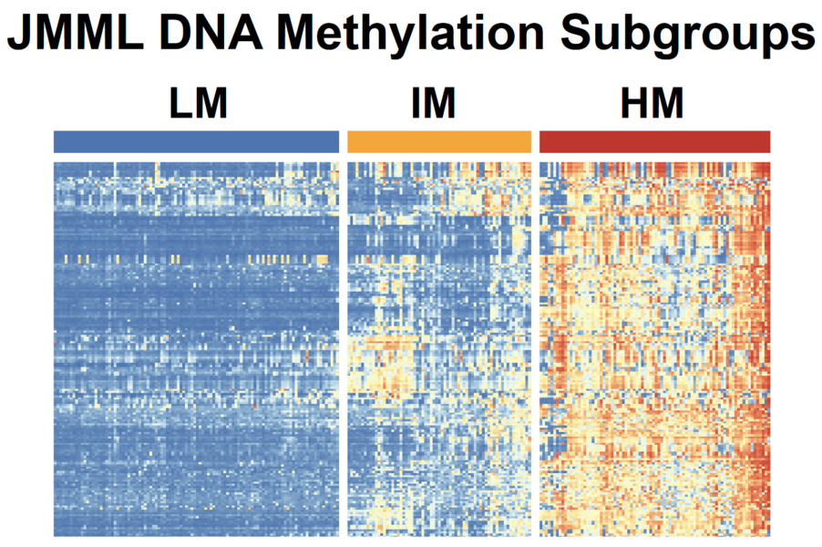 Forscher haben herausgefunden, dass die Krebsentstehung nicht nur ein rein genetischer Prozess ist. Auch Markierungen auf dem Erbgut können das unkontrollierte Wachstum von Zellen begünstigen. Wissenschaftler haben daher das Erbgut von JMML-Zellen auch auf das Auftreten von bestimmten chemischen Erbgutmarkierungen, der DNA-Methylierung, untersucht. Diese sogenannten epigenetischen Veränderungen steuern die Aktivität einzelner Gene. "Je nachdem, wie stark die DNA methyliert ist, lassen sich JMML-Patienten in drei Gruppen einteilen: Patienten, bei denen das Erbgut der Tumorzellen stark methyliert ist, weisen meist Merkmale auf, die mit einem erhöhten Rückfallrisiko nach Stammzelltransplantation verknüpft sind. Bei einer weiteren Patientengruppe, deren Tumorgenom nur schwach methyliert ist, verläuft die Krankheit in der Regel milder. Eine dritte Gruppe hat ein mittleres Maß an DNA-Methylierung", berichtet Daniel Lipka, Leiter der Sektion Translationale Krebsepigenomik in der Abteilung Translationale Medizinische Onkologie des DKFZ und am NCT Heidelberg. Die Analyse des DNA-Methylierungsstatus wird daher inzwischen auch als Biomarker eingesetzt, um den Krankheitsverlauf der JMML-Patienten besser abschätzen zu können.