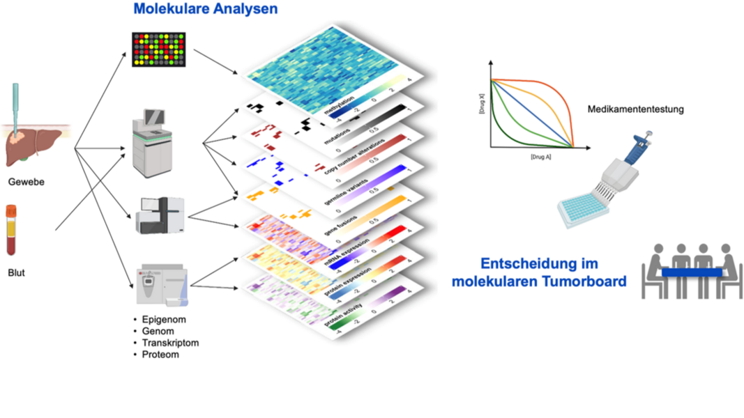 Schematischer Workflow in der Studie RATIONALE: Gewebe- und Blutproben werden molekular analysiert. Anhand der Analyseergebnisse bewertet das interdisziplinäre molekulare Tumorboard die Fälle und gibt eine Therapieempfehlung für eine zielgerichtete Medikation.