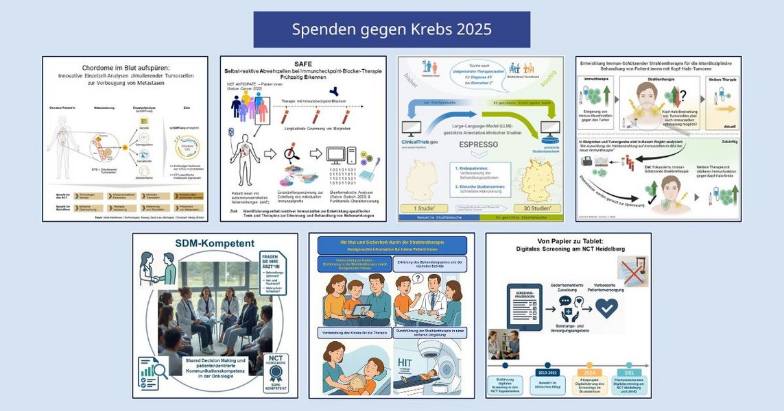 Every year, teams at the NCT Heidelberg can apply for funding from the “Donations Against Cancer” program with innovative ideas. An interdisciplinary jury reviews the applications and selects projects that improve patient care and open up new avenues in cancer research. This year, four projects from translational research and three from nursing and counseling were selected.