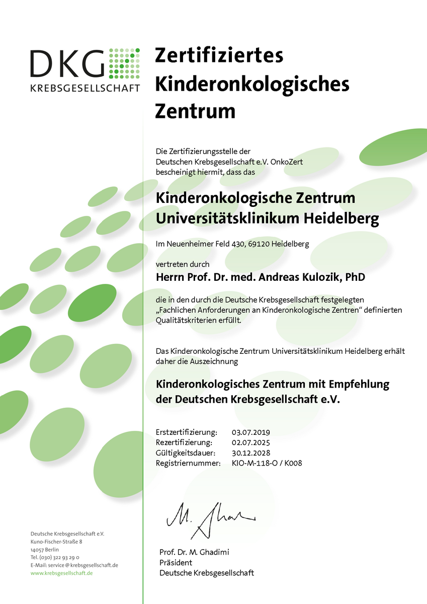 At the Department of Pediatric Oncology, Hematology, Immunology and Pneumology (Center for Pediatric and Adolescent Medicine) at Heidelberg University Hospital (UKHD), children and adolescents with cancer and other complex diseases of the blood and coagulation system are treated as outpatients and inpatients. The Pediatric Oncology Center at Heidelberg University Hospital (UKHD) has been certified according to the criteria of the German Cancer Society (DKG) since 2019.