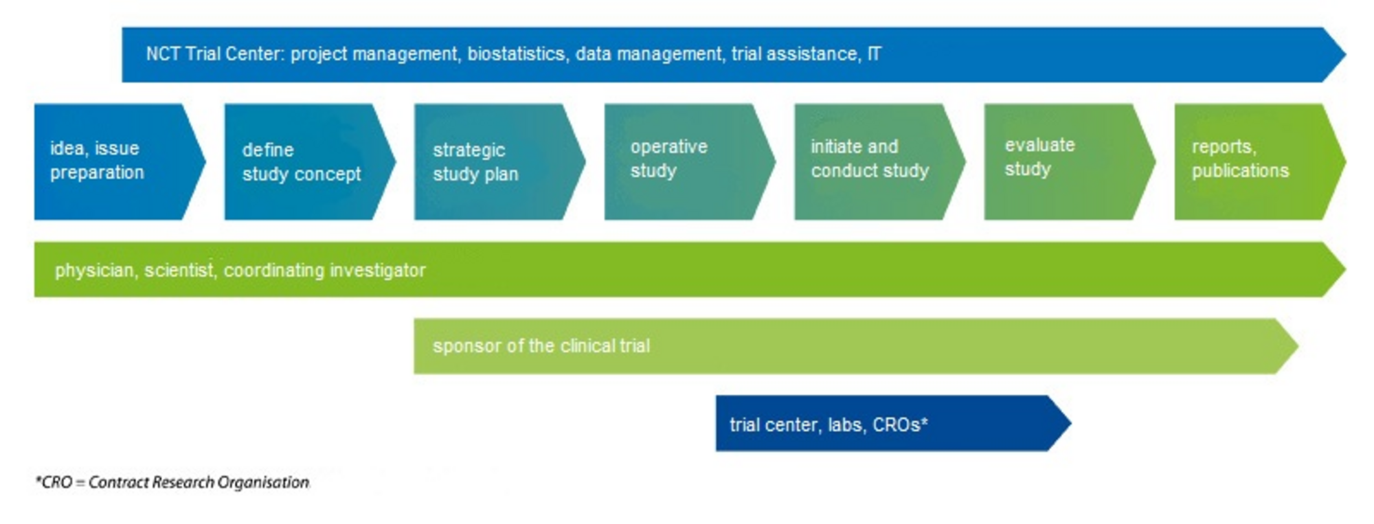 Comprehensive quality-assured templates are available for preparing the necessary study documents during trial set-up, application with ethics committee and regulatory authorities, and trial conduct. The NCT Heidelberg Trial Center actively assists in