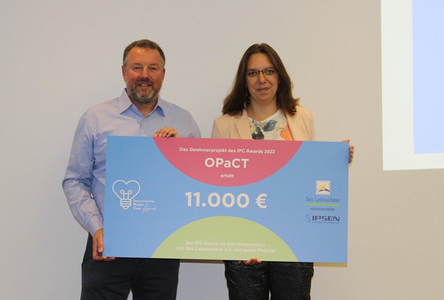 Für die innovative Idee und Umsetzung hat OPaCT den Innovation for Patient Care Award 2022 gewonnen. Der Innovationspreis für neue Perspektiven in der Onkologie stand bei der jüngsten Verleihung unter dem Thema "Reden über Krebs". Der Preis ist mit 11.000 Euro dotiert und wird gemeinsam vom Nierenkrebs-Netzwerk Deutschland e.V. und dem Unternehmen Ipsen verliehen.