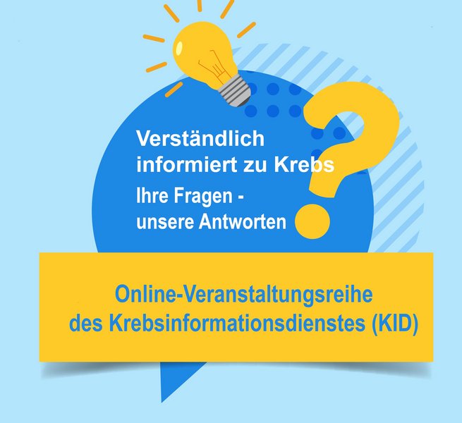 Die neue Online-Veranstaltungsreihe Verständlich informiert zu Krebs – Ihre Fragen unsere Antworten des Krebsinformationsdienstes richtet sich an die breite Öffentlichkeit. Ziel ist es, über relevante Aspekte einer Krebserkrankung zu informieren und sich mit Betroffenen, Angehörigen und Interessierten auszutauschen. Die Veranstaltung ist kostenlos. Anmeldung online oder per E-Mail unter kid-veranstaltung(at)dkfz-heidelberg.de