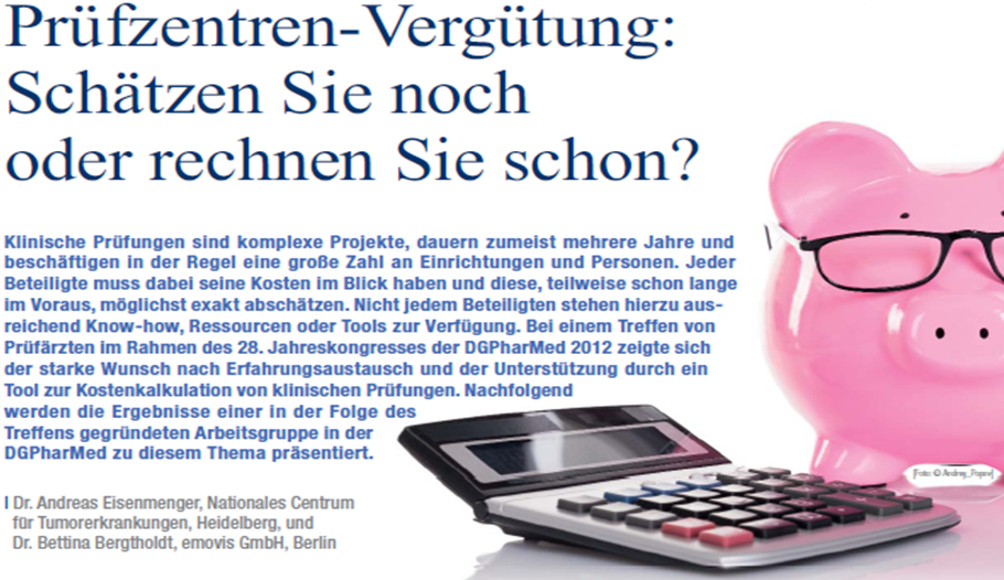 Zusammen mit Kollegen aus der „Deutschen Gesellschaft für Pharmazeutische Medizin“ (DGPharMed; www.dgpharmed.de) hat Dr. Andreas Eisenmenger die Kosten von Prüfzentren in klinischen Studien analysiert, Berechnungsmethoden verglichen und ein Tool zur Kalkulation von Prüfzentrumskosten erarbeitet.