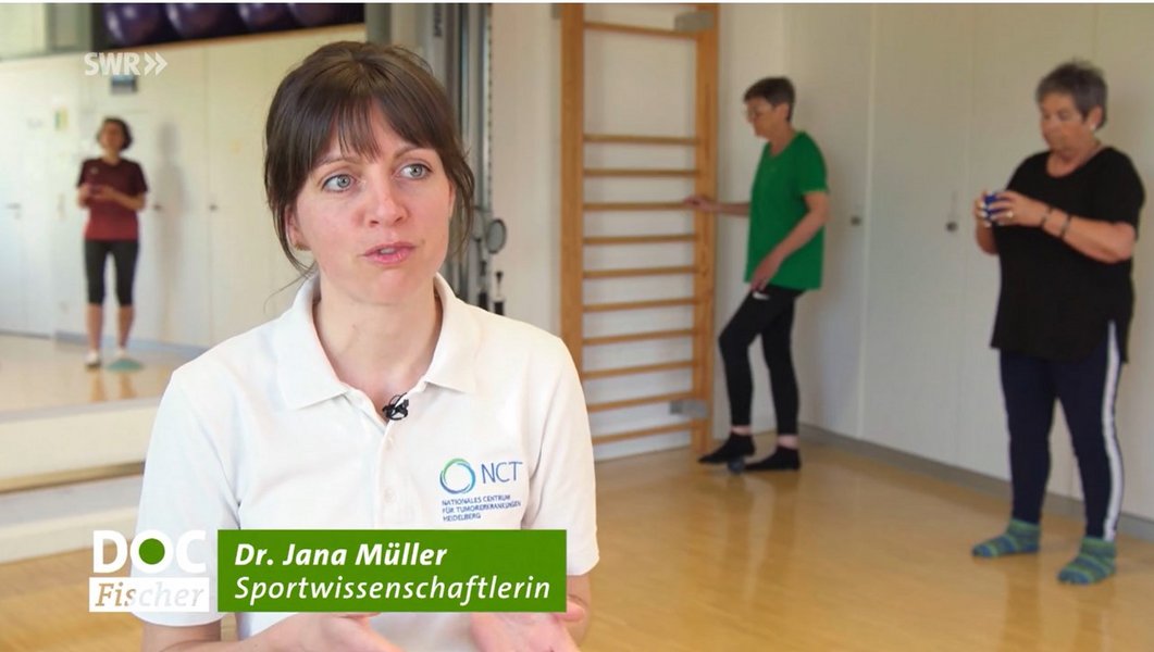 Vor Kurzem war das Gesundheitsmagazin Doc Fischer des SWR-Fernsehens am NCT Heidelberg zu Gast. Das Team besuchte eine Trainingsgruppe und ließ sich von Sportwissenschaftlerin Jana Müller aus der Onkologischen Sport- und Bewegungstherapie erläutern, wie das Programm und die Übungen funktionieren.