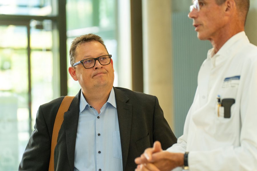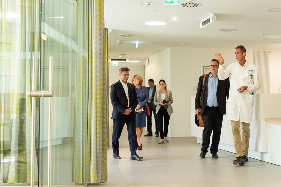 Der Besuch begann mit einer kurzen Besichtigung des NCT Heidelberg. Dirk Jäger, Ärztlicher Direktor der Klinik für Medizinische Onkologie und Geschäftsführender Direktor des NCT Heidelberg, führte Stefan Schwartze durch das Gebäude.