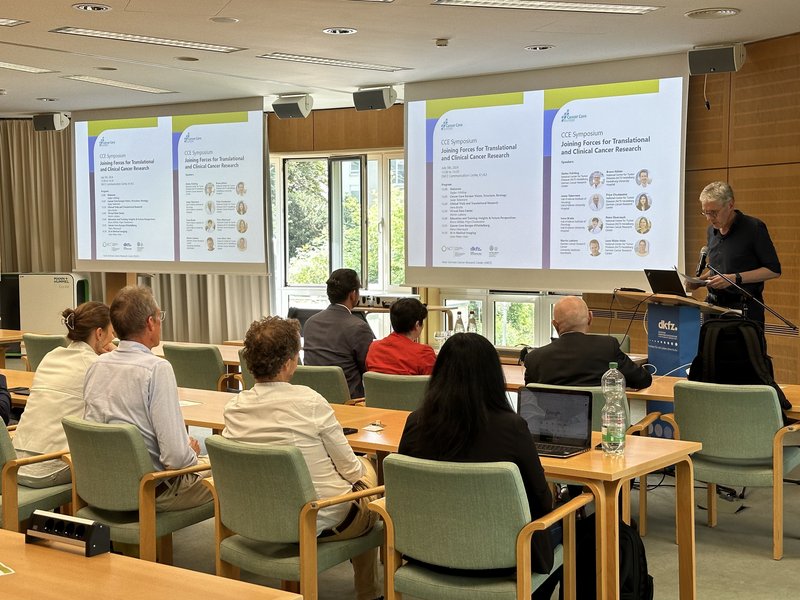 Beim anschließenden, öffentlichen CCE-Symposium „Joining Forces for Translational and Clinical Cancer Research“ erläuterte Josep Tabernero in seinem Eröffnungsvortrag die Vision, Struktur sowie Strategie von CCE und machte deutlich, dass viele Herausforderungen in der Krebsforschung nur gemeinschaftlich gelöst werden können. Auch Irene Braña stellte ihren Talk unter das Motto „What can we do collectively that we cannot do individually?“ und präsentierte die CCE-Arbeit rund um klinische Studien und translationale Forschung. Martin Lablans, DKFZ und Universitätsmedizin Mannheim, sprach danach über das CCE Virtual Data Center, das aktuell federführend durch seine Abteilung aufgebaut wird. Priya Chudasama, DKFZ und NCT Heidelberg, und Bruno Köhler, Universitätsklinikum Heidelberg (UKHD) und NCT Heidelberg, teilten eigene Erfahrungen aus der CCE Summer School und dem TRYTRAC-Programm (advanced TRaining program for Young leaders in TRAnslational Cancer research) und präsentierten die CCE-Angebote zu Bildung und Ausbildung. Einen Überblick über die Struktur und die Ansprechpartner:innen in Heidelberg gab Petra Oberrauch, NCT Heidelberg und Mitglied des CCE Operational Board. Die Teilnehmenden des Symposiums nutzen die Gelegenheit für Fragen und so gab es gute Diskussionen zu den einzelnen Themen. Lena Maier-Hein, Geschäftsführende Direktorin am NCT Heidelberg und Abteilungsleiterin am DKFZ, verdeutlichte im Abschlussvortrag die Bedeutung von Künstlicher Intelligenz (KI) für die medizinische Bildgebung, zeigte den aktuellen Stand sowie Chancen und Hürden auf.