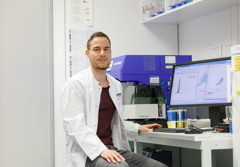 Der dritte Doktorand im Bunde, Gregor Grill, gehört seit einigen Monaten dem Team um Fröhling und Professor Claudia Scholl an. Der gebürtige Österreicher kam gleich nach der Schule im österreichischen Zivildienst zur Medizin. Als Rettungssanitäter hat ihn ein besonders motivierter Kollege, der bereits einen Studienplatz für Medizin in Aussicht hatte, mit seiner Faszination angesteckt. Für die Onkologie hat sich Gregor Grill dann bei einem Praktikum in einem kleinen Krankenhaus in Österreich entschieden: „Die Krebs medizin ist ein spannendes Feld, das sich schnell weiterentwickelt. Neben der wissenschaftlichen Arbeit bin ich aber auch gerne in der Patientenversorgung tätig und mag den Umgang mit den Menschen.“