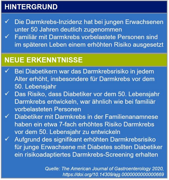 Während des Studienzeitraums von 1964 bis 2015 hatten insgesamt 559.375 der untersuchten Personen Diabetes und 162.226 eine Darmkrebserkrankung. Die Auswertung dieser weltweit größten Datenbank ihrer Art zeigte, dass bei Diabetikern das Risiko für Darmkrebs in allen Altersgruppen erhöht war. Das Risiko, in jungen Jahren an Darmkrebs zu erkranken, war bei Diabetikern ohne Verwandte mit Darmkrebs sogar ähnlich hoch wie bei familiär vorbelasteten Nicht-Diabetikern. Diabetiker, bei deren Verwandten ersten Grades Darmkrebs diagnostiziert wurde, hatten gegenüber der Allgemeinbevölkerung ein etwa 7-fach erhöhtes Risiko, bereits unter 50 Jahren selber Darmkrebs zu entwickeln.