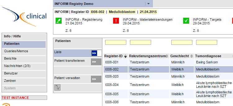 The data management of the NCT Trial Center collects requirements of all involved parties. It coordinates the process and prepares the setup of the MARVIN system. The INFORM registry was launched in January 2015. The NCT trial center is now also responsible for the user Management of INFORM and serves as helpdesk for questions regarding the INFORM registry in MARVIN. All uploaded data are checked for completeness and plausibility. If follow up data are not entered on time, a reminder, is send.