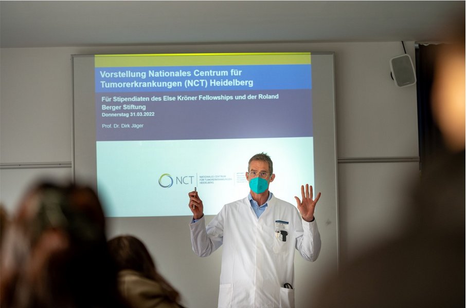 Grundlegende Informationen zu Krebserkrankungen und ihrer Behandlung aus erster Hand – das war das Programm eines Besuchs von knapp 20 Else Kröner Fellows am Nationalen Centrum für Tumorerkrankungen (NCT) Heidelberg. Die Besucher:innen sind Stipendiat:innen der Roland Berger Stiftung, die zusätzlich mit Unterstützung der Else Kröner-Fresenius-Stiftung gefördert werden, weil sie das Ziel haben, Medizin zu studieren und die meisten von ihnen als erste in ihren Familien eine Universität besuchen werden.