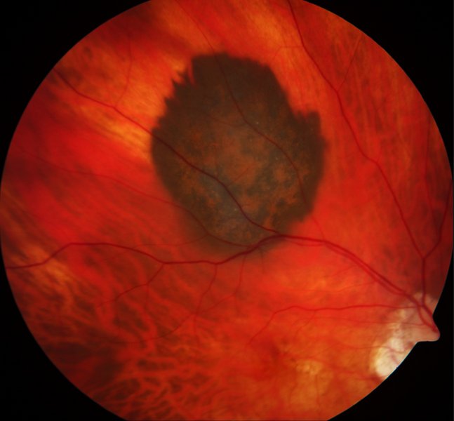 Das Aderhautmelanom zeichnet sich dunkel gegen das gesunde Gewebe des Augenhintergrundes ab.
