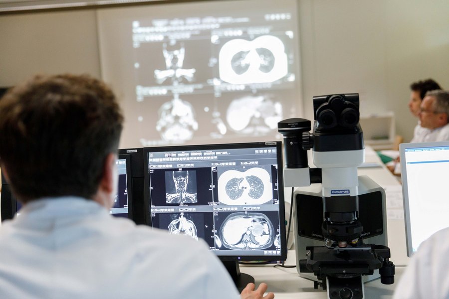 BU: Im Tumorboard kommen Experten verschiedener medizinischer Fachrichtungen zusammen und besprechen die weitere Behandlungsplanung eines Patienten.