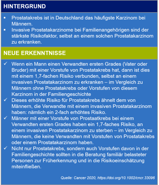 "Unsere Auswertungen dieser weltweit größten Datenbank dieser Art zeigten: Wenn bei Verwandten ersten Grades - also bei Vater oder Bruder - eine Vorstufe von Prostatakrebs auftritt, dann ist dies für Männer mit einem 1,7-fachen Risiko verbunden, selbst an einem invasiven Prostatakarzinom zu erkranken - im Vergleich zu Männern ohne Prostatakrebs oder Krebsvorstufen in der Familiengeschichte", berichtet Mahdi Fallah. Dieses erhöhte Risiko für Prostatakrebs ähnelt dem von Männern, die Verwandte mit einem invasiven Prostatakarzinom haben: nämlich ein 2-fach erhöhtes Risiko.