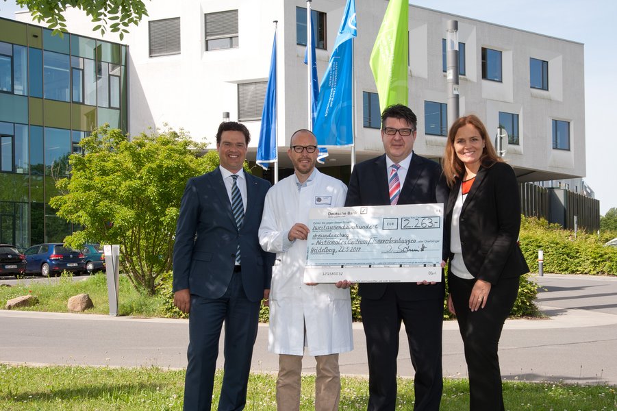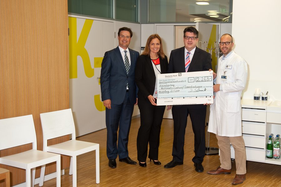 Mitarbeiter der Deutschen Bank spendeten 2.263 Euro für die kinderonkologische Sprechstunde des NCT. Überreicht wurde der Spendenscheck Ende Mai durch Andrea Riesberg und Dirk Schmitt, beide Mitglied der Geschäftsleitung der Deutschen Bank in Mannheim, an Professor Olaf Witt, Leiter der Sektion Pädiatrische Hirntumoren NCT. Mit Hilfe der Spendensumme wird der Empfangs- und Wartebereich der kinderonkologischen Sprechstunde des NCT kindgerechter gestaltet werden.